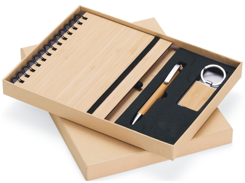 Kit Executivo Ecológico 3 Peças, sendo uma caderneta de bambu com capa dura, contendo aproximadamente 70 folhas brancas pautadas,