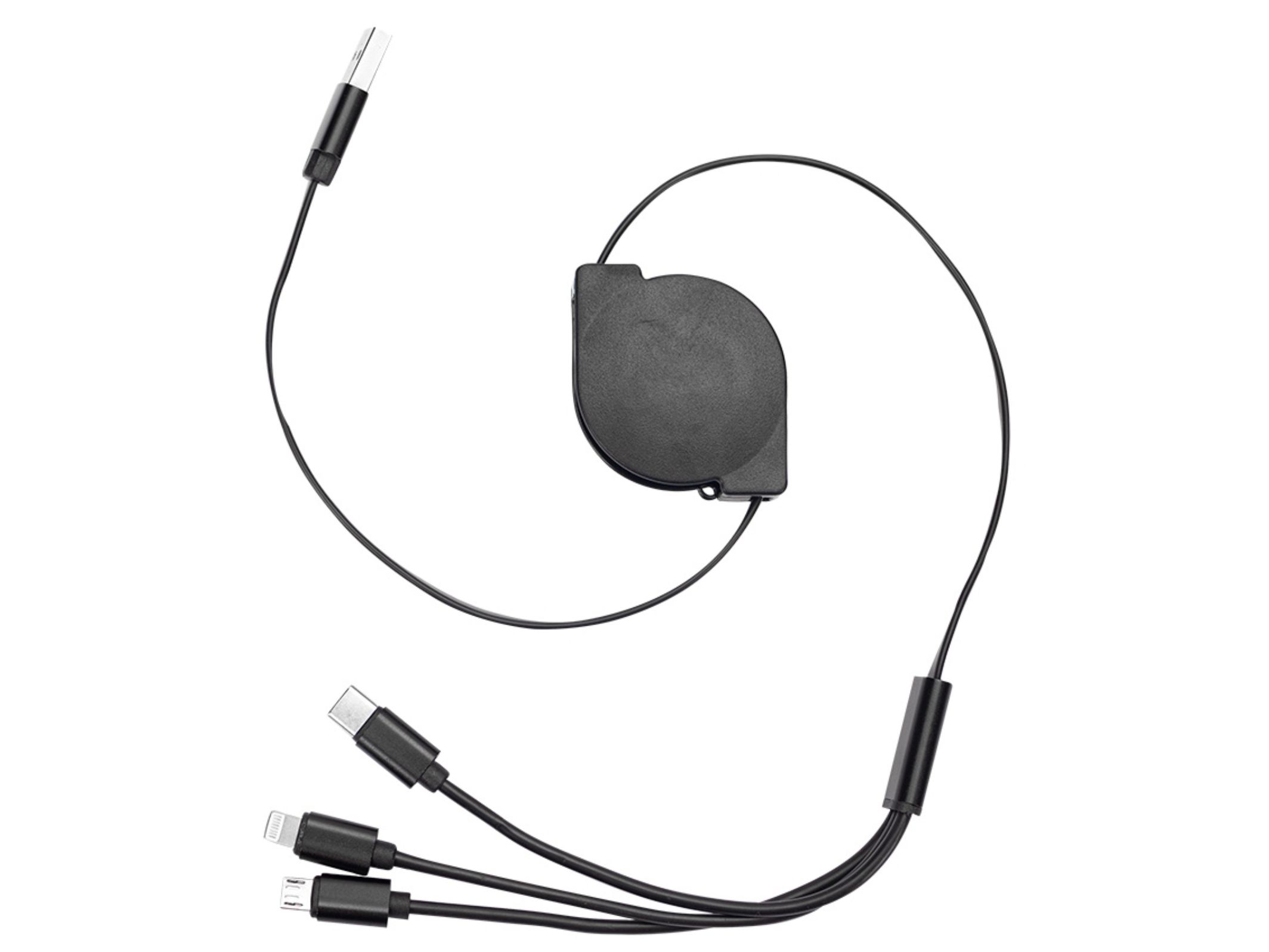 Cabo USB retrátil com as entradas Lightning/iPhone, V8/Android e Tipo-C/Android.