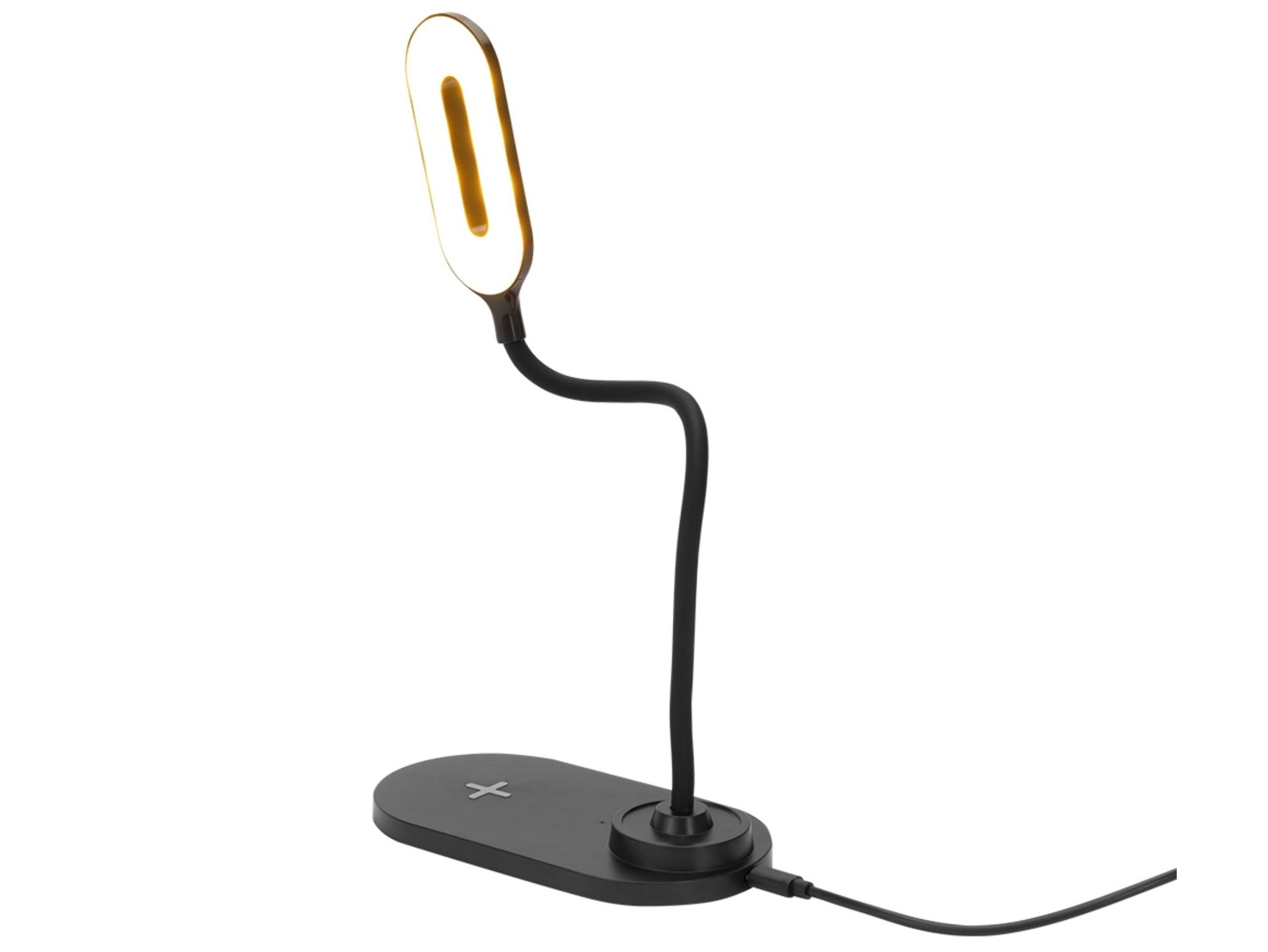 A luminária LED com 3 estágios de iluminação. Feita em plástico com base antideslizante e haste articulável, três opções de luz com ajuste de intensidade: 10 LEDs em luz quente, 10 LEDs em luz fria e 20 LEDs com luz mista, adaptando-se perfeitamente a diferentes ambientes e necessidades. Sua base permite o carregamento de celulares via indução, através da área indicada por um sinal de +. Para garantir a iluminação e o carregamento, basta conectar o produto a uma fonte de energia, pois ele não armazena bateria. Acompanha cabo USB Tipo-C.