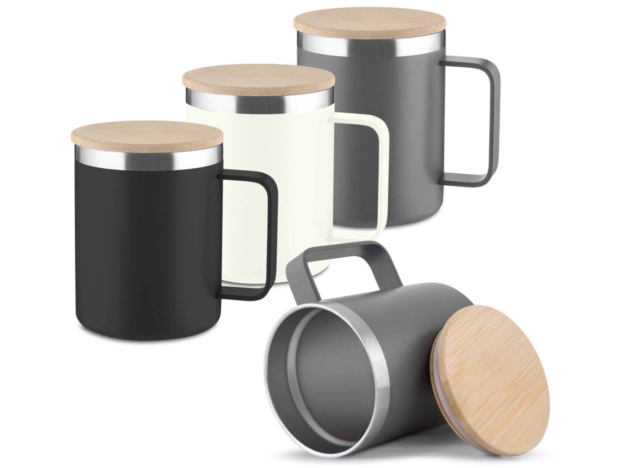 Caneca Térmica em inox 350 ml, com tampa em bambu com anel de vedação em silicone.