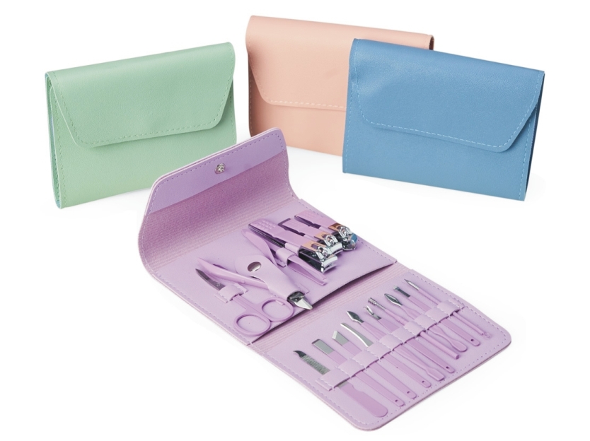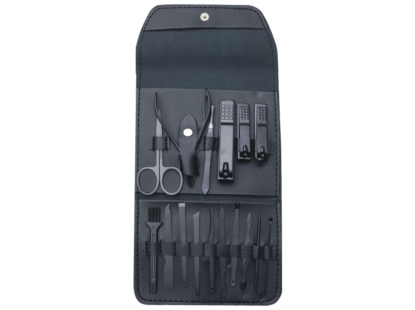 Contém: tesoura, alicate de cutícula, pinça, 3 cortadores de unha, lixa, 2 bisturis, raspador, empurrador de cutícula, removedor de cutícula, espátula dupla para limpeza das unhas, limpador de ouvido, palito de unha e espátula para ouvido.