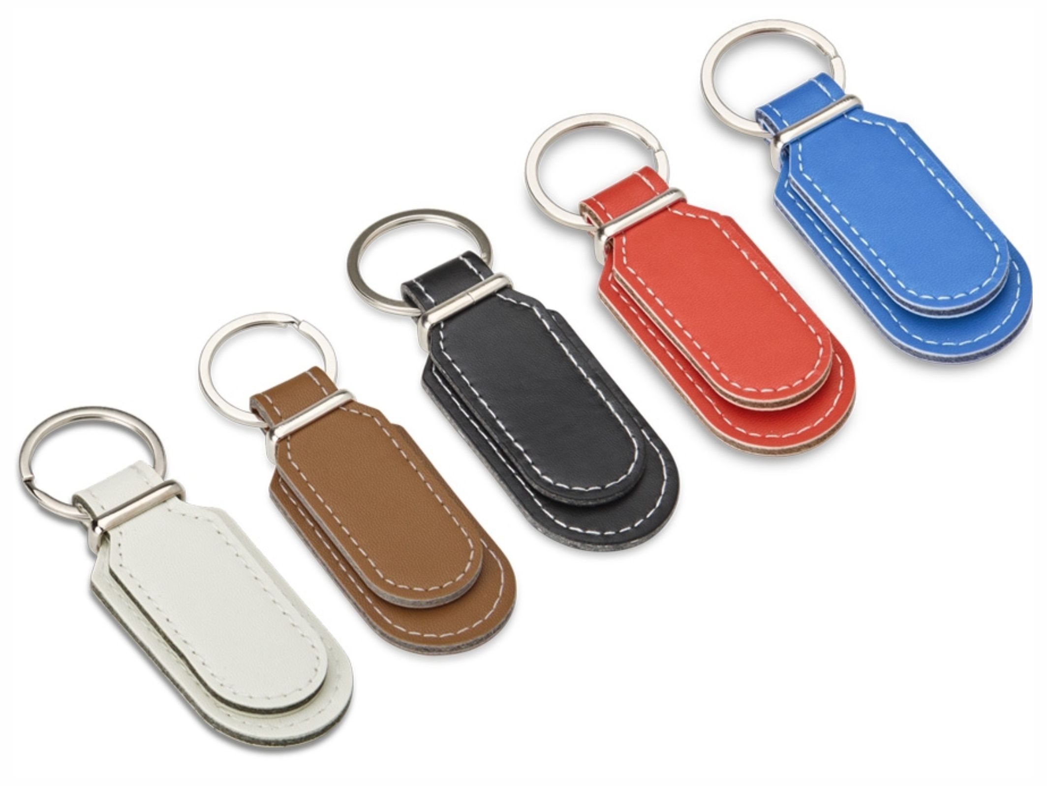 Chaveiro de couro sintético com detalhe em metal e frente e verso lisos.