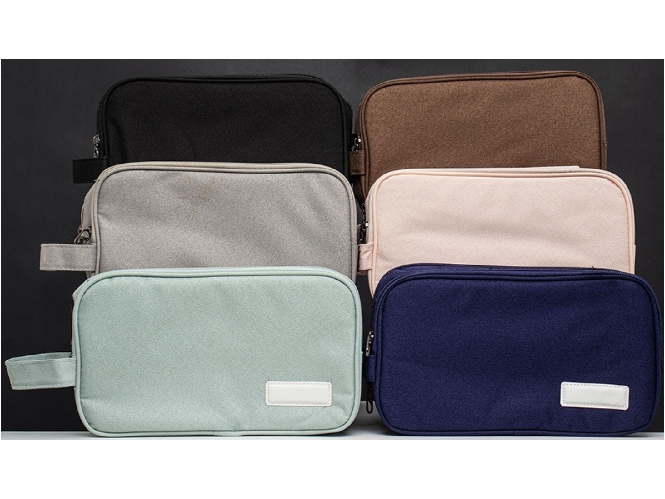 Nécessaire Poliéster resistente à água, possui três compartimentos: um com divisórias, outro com dois bolsos.