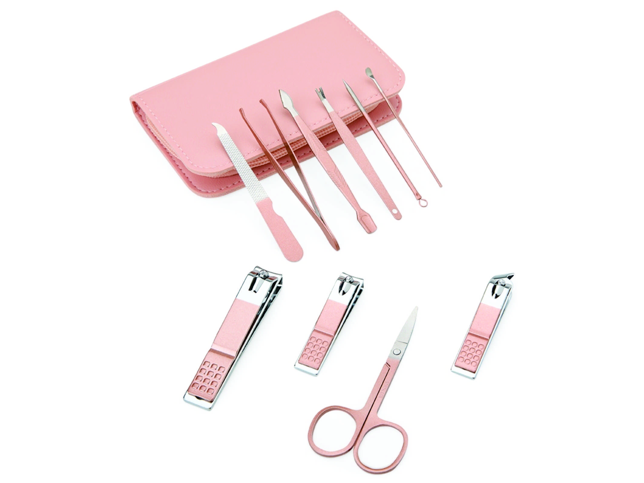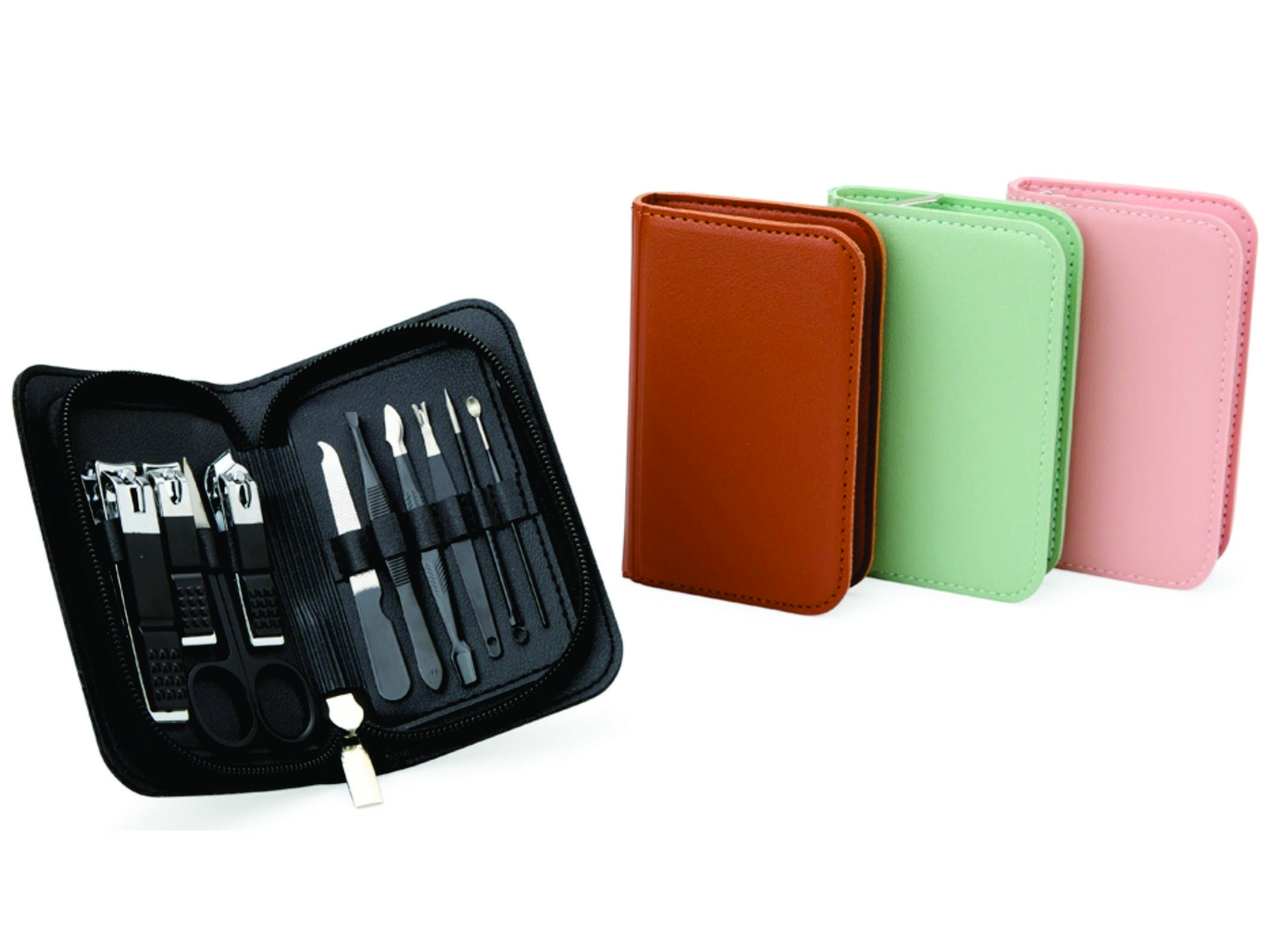 Com três cortadores de unha, tesoura, lixa, pinça, empurrador de cutícula, removedor de cutícula, palito de unha e espátula para ouvido.
