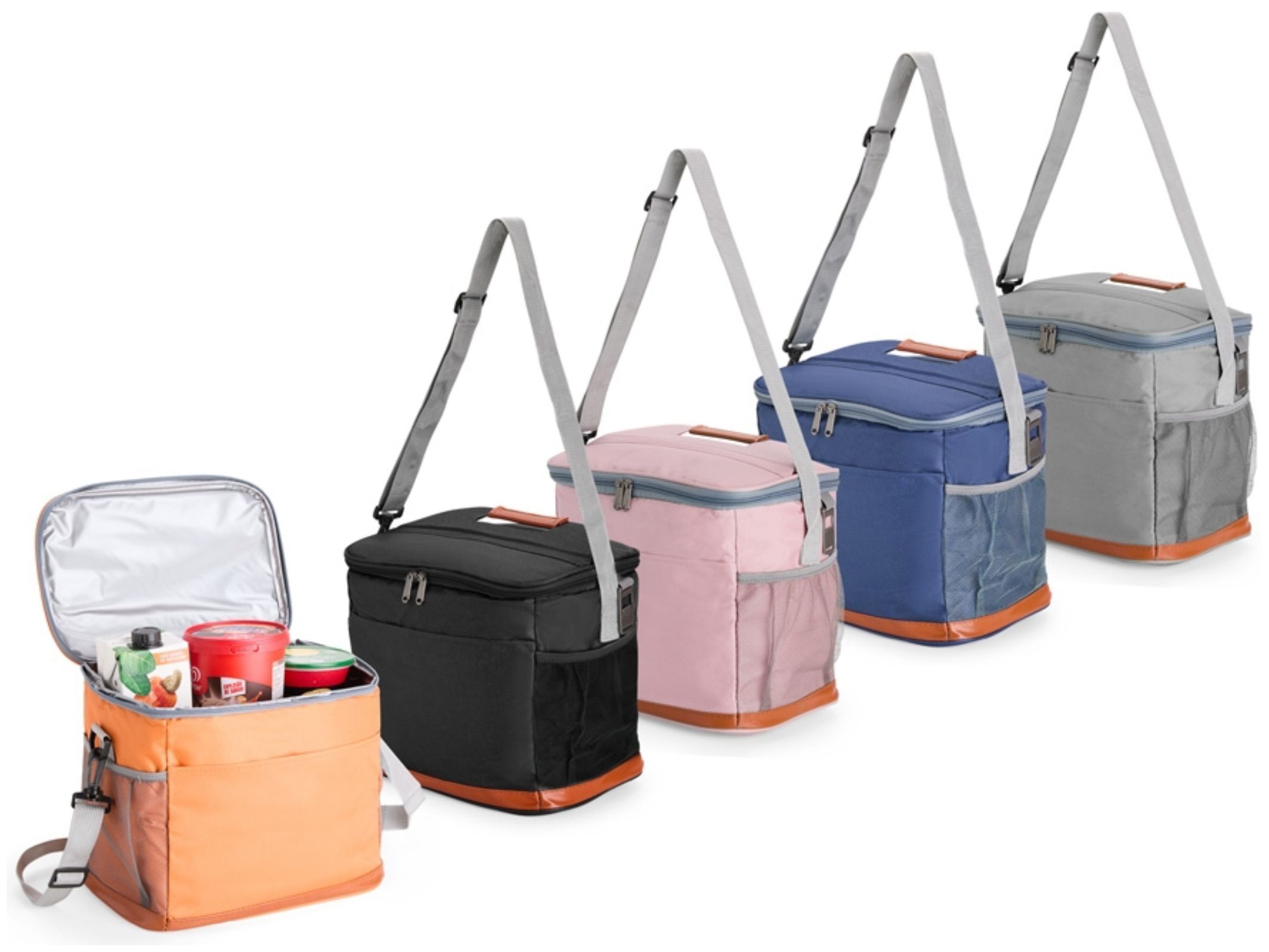 Possui revestimento interno em PEVA, com bolso frontal aberto, dois laterais em tela de nylon com elástico, alça de mão, alça transversal ajustável e abridor de garrafas em inox fixado em uma das laterais.