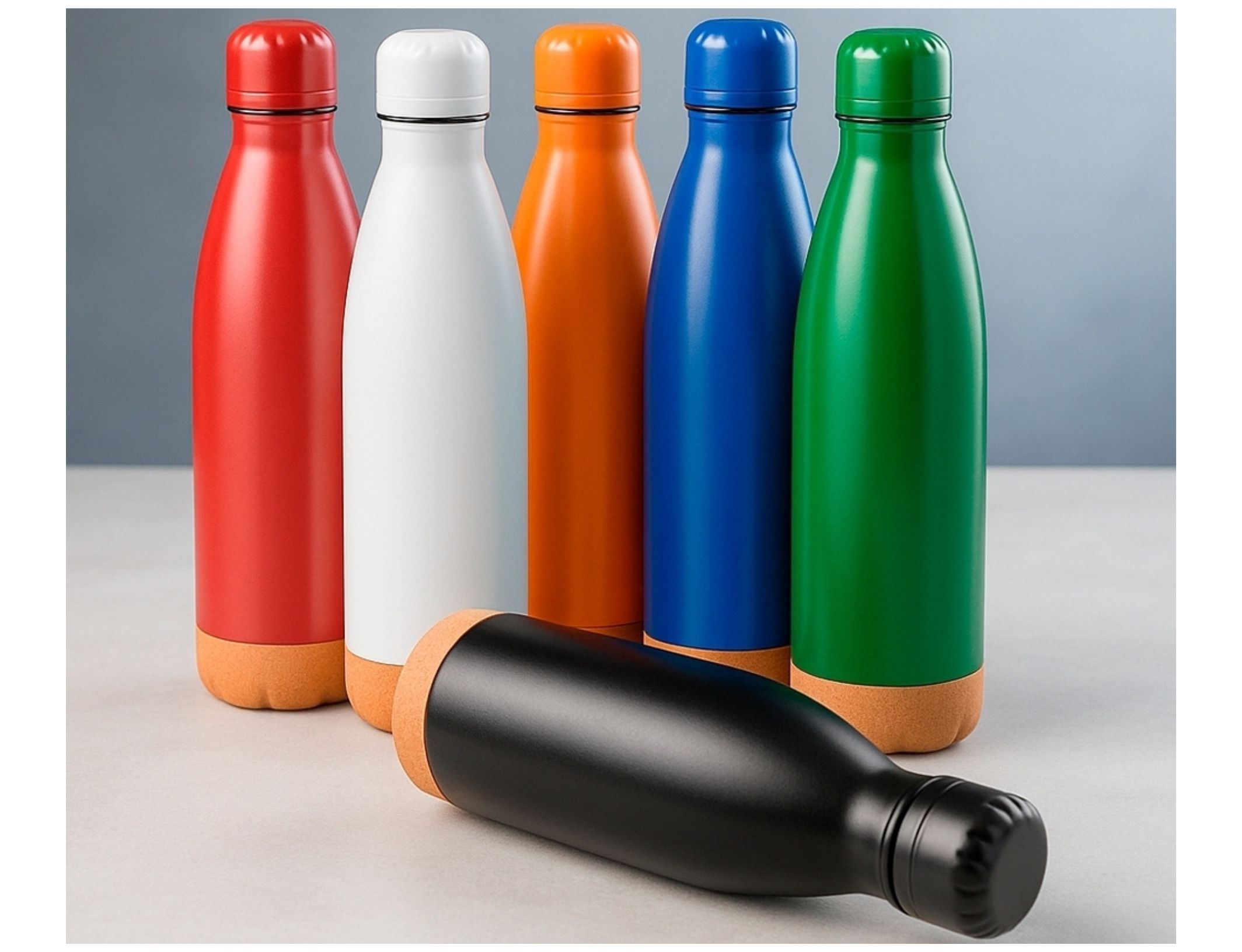 Garrafa Térmica Inox com fundo em cortiça, tampa rosqueável e capacidade 500 ml.