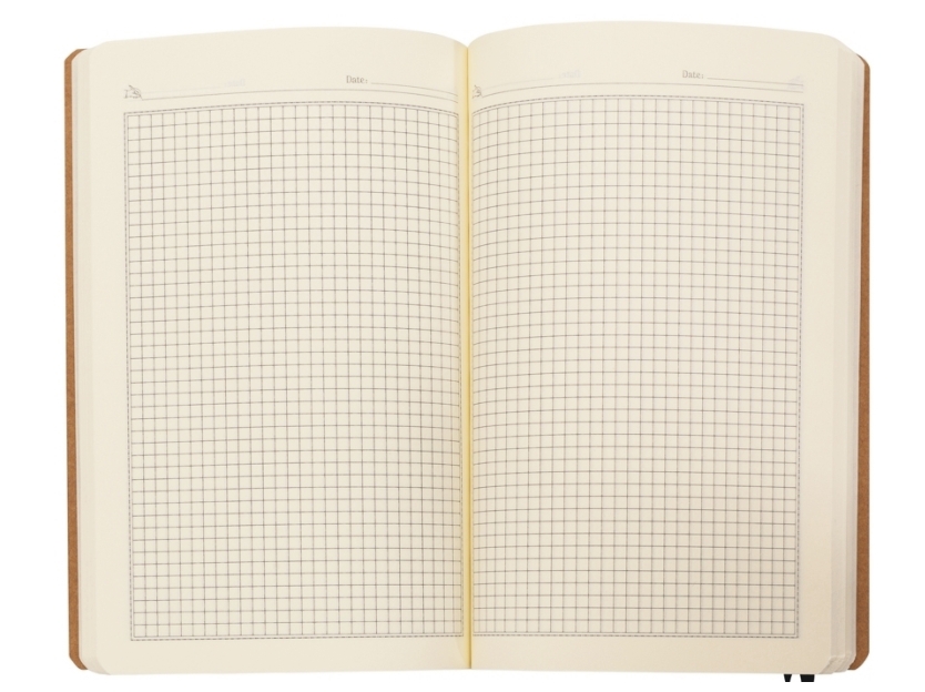 Caderneta com páginas quadriculadas, produzido em material kraft com frente e verso liso e fita elástica para fechar.
