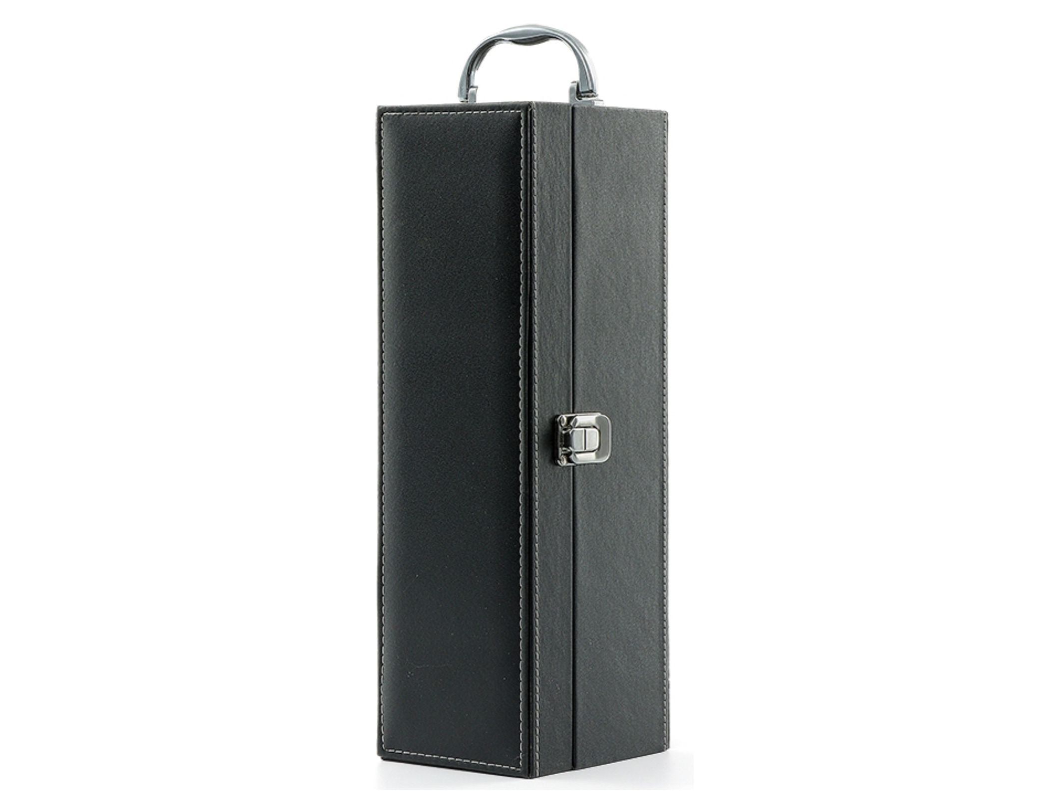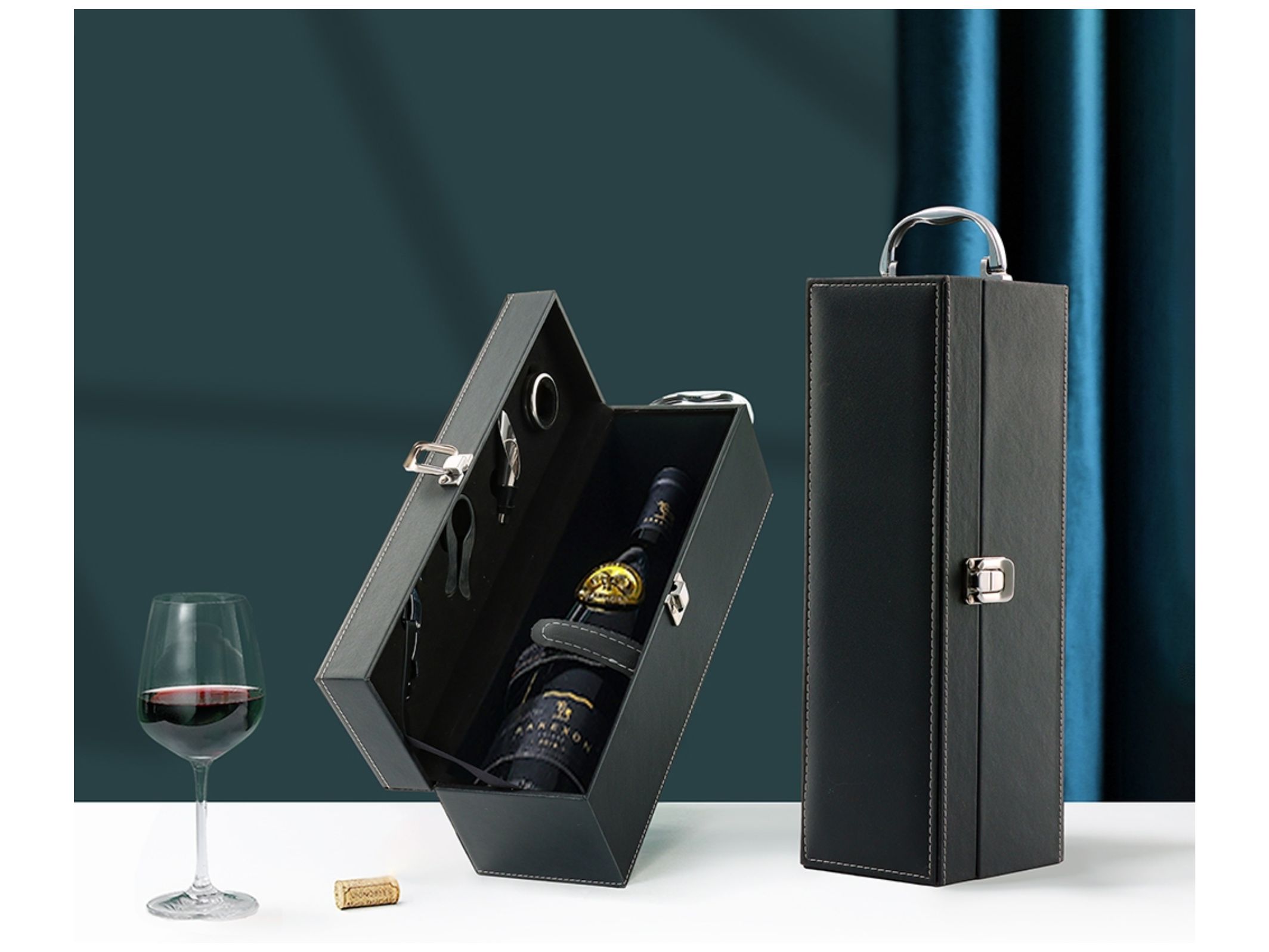 Kit vinho 4 peças em maleta de couro sintético. Contém saca-rolhas metálico, bico condutor com tampa, cortador de lacre e wine colar. Maleta com alça, trava de segurança e parte interna revestida de veludo com área de acomodação para uma garrafa.