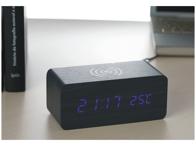 Carregador por Indução com Relógio digital LED possui alarme, medidor de temperatura e carregamento por indução, carregando smartphones e outros dispositivos compatíveis de forma rápida e fácil, sem a necessidade de fios.