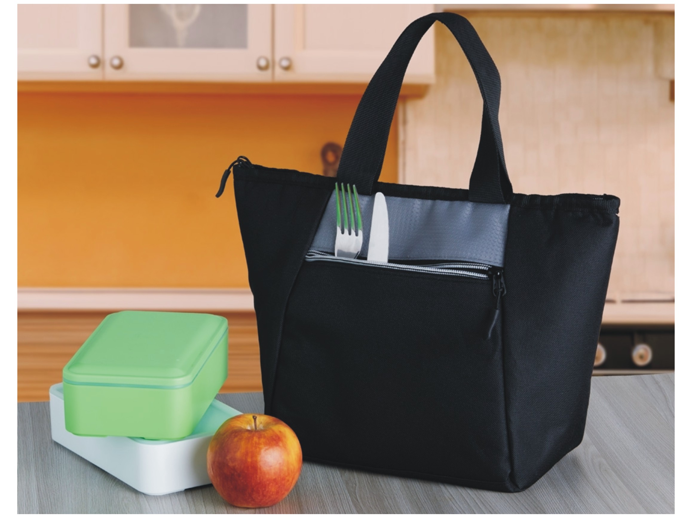 Bolsa térmica com capacidade de 7 litros com bolso frontal e alças de mãos.