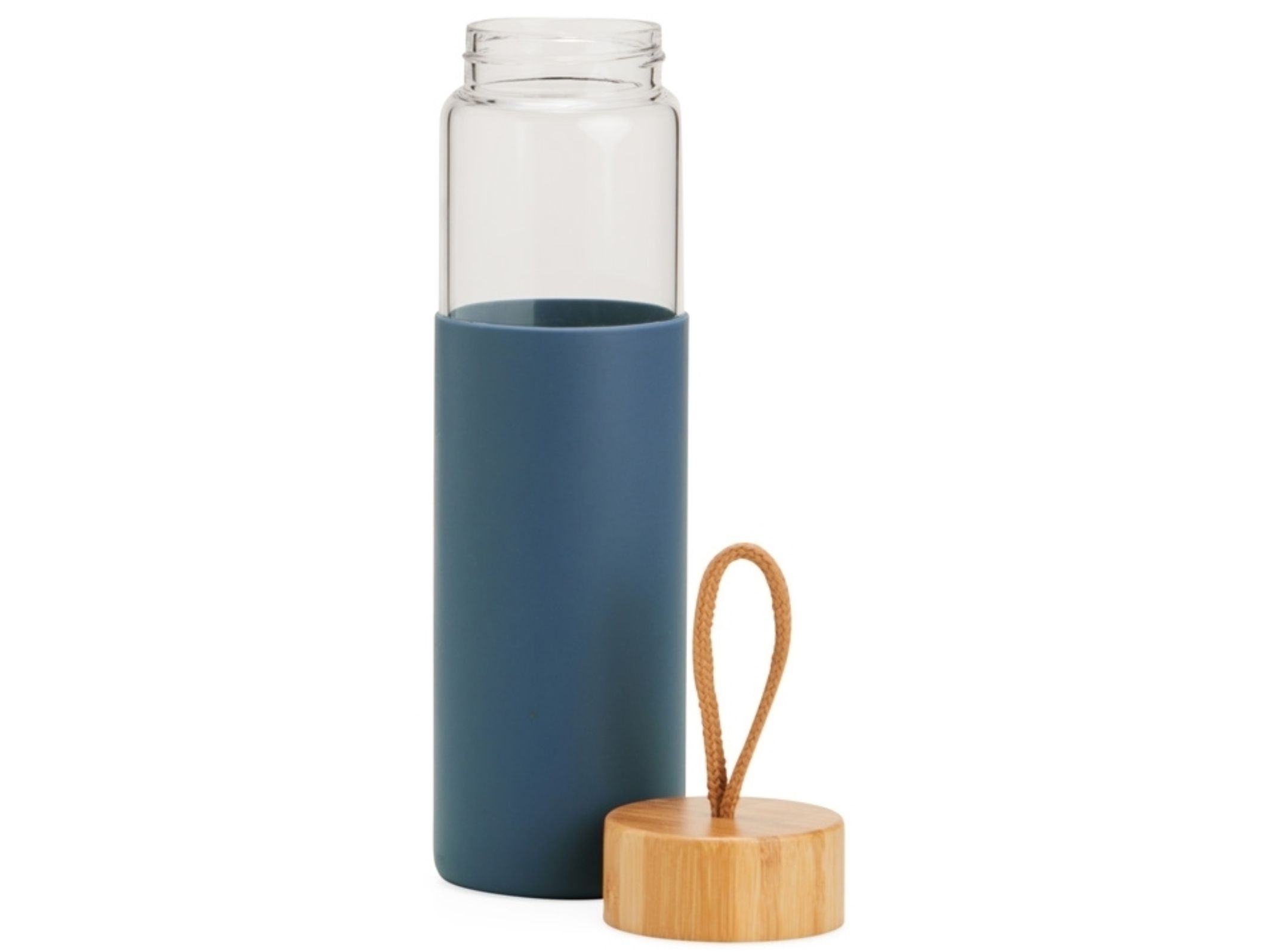 Contém tampa de bambu com alça de algodão e luva de silicone.