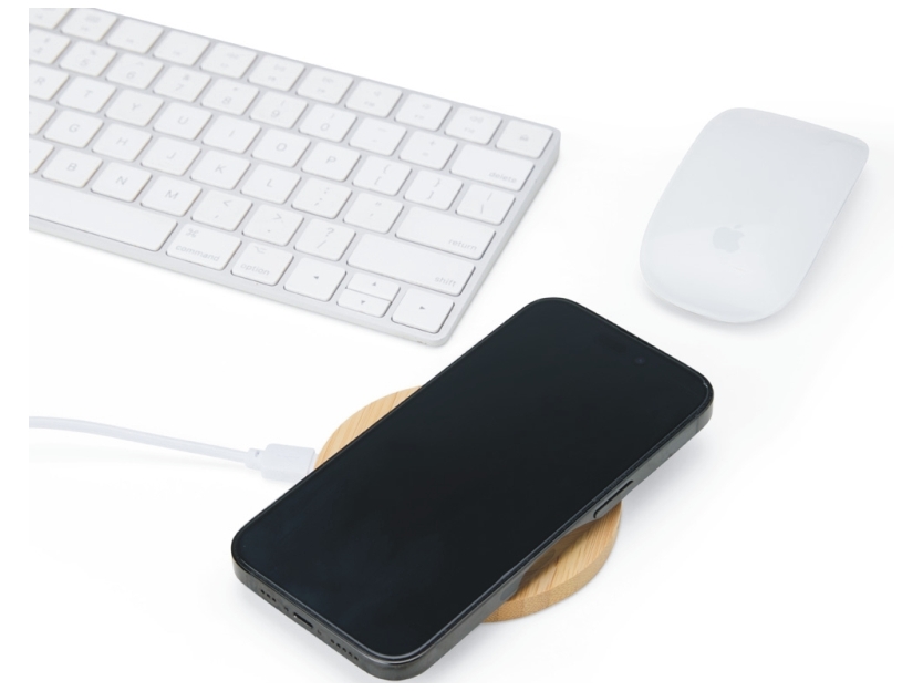 Carregador via indução formato disco com indicador de funcionamento em led, feito em Bambu.