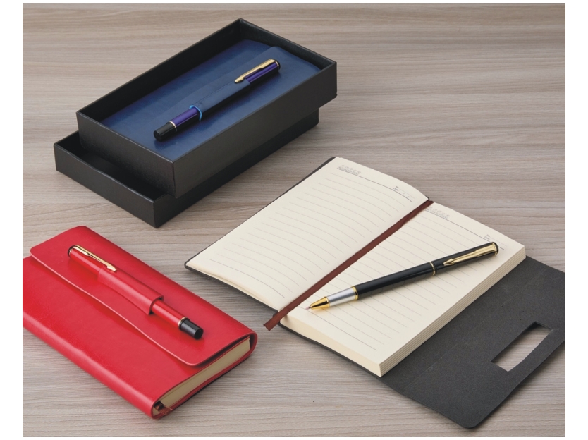 caneta metálica com carga esferográfica azul e um porta-caneta que também serve como fecho para o kit,