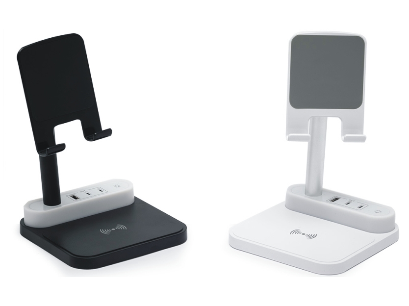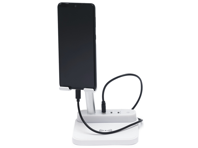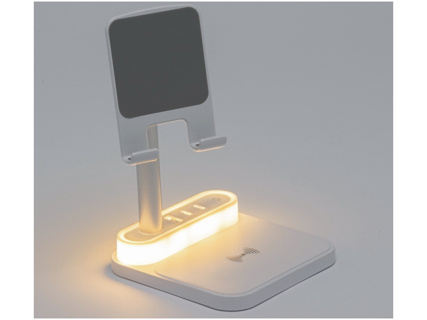 Base de carregamento com suporte retrátil para celular e luminária integrada.