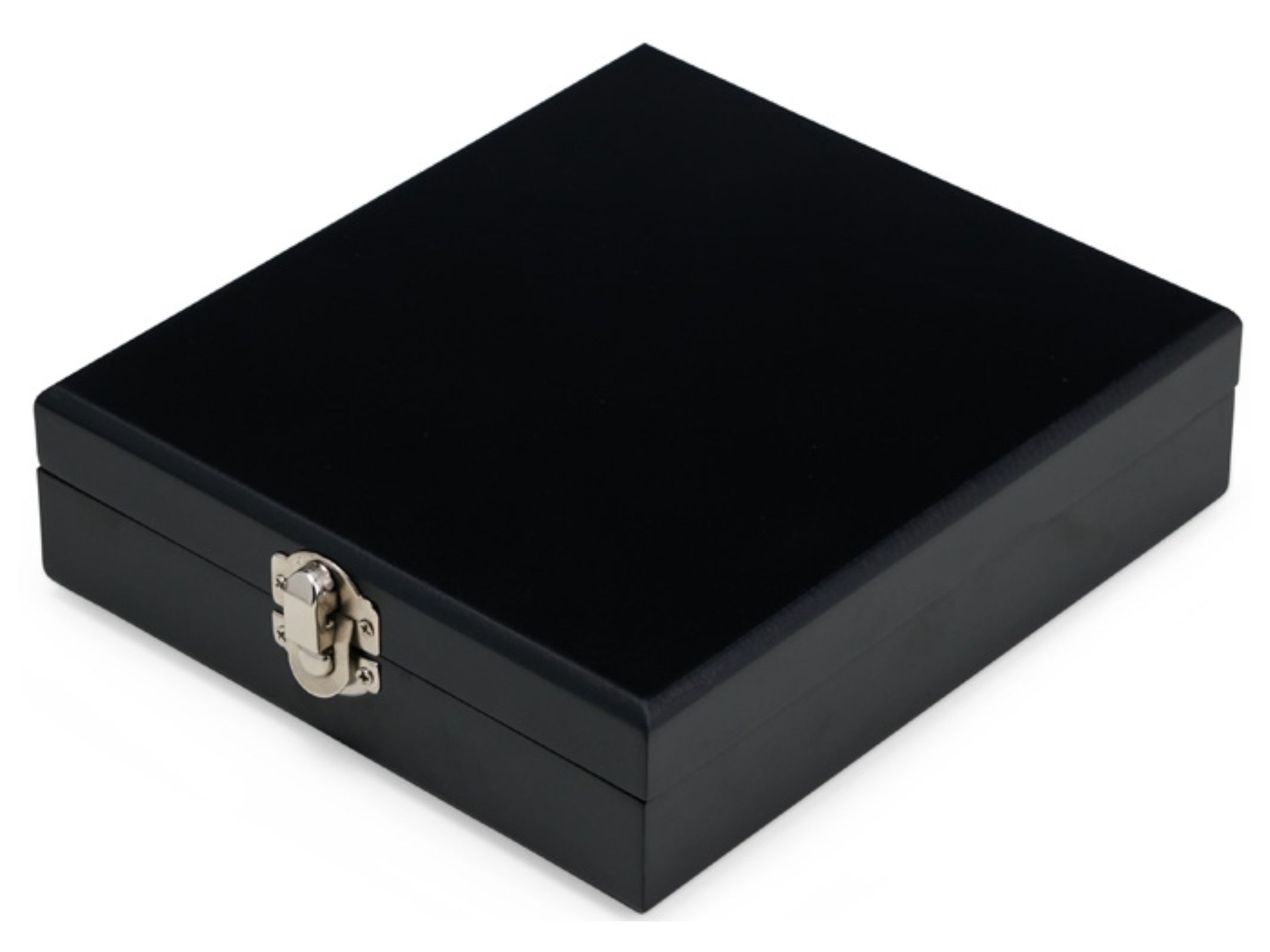Kit Vinho com 4 peças vem em um estojo feito em MDF com trava de segurança e área interna com berço de espuma. Contém wine collar, tampa de bico, bico condutor com tampa e saca-rolhas metálico com lâmina de corte e abridor de garrafa.