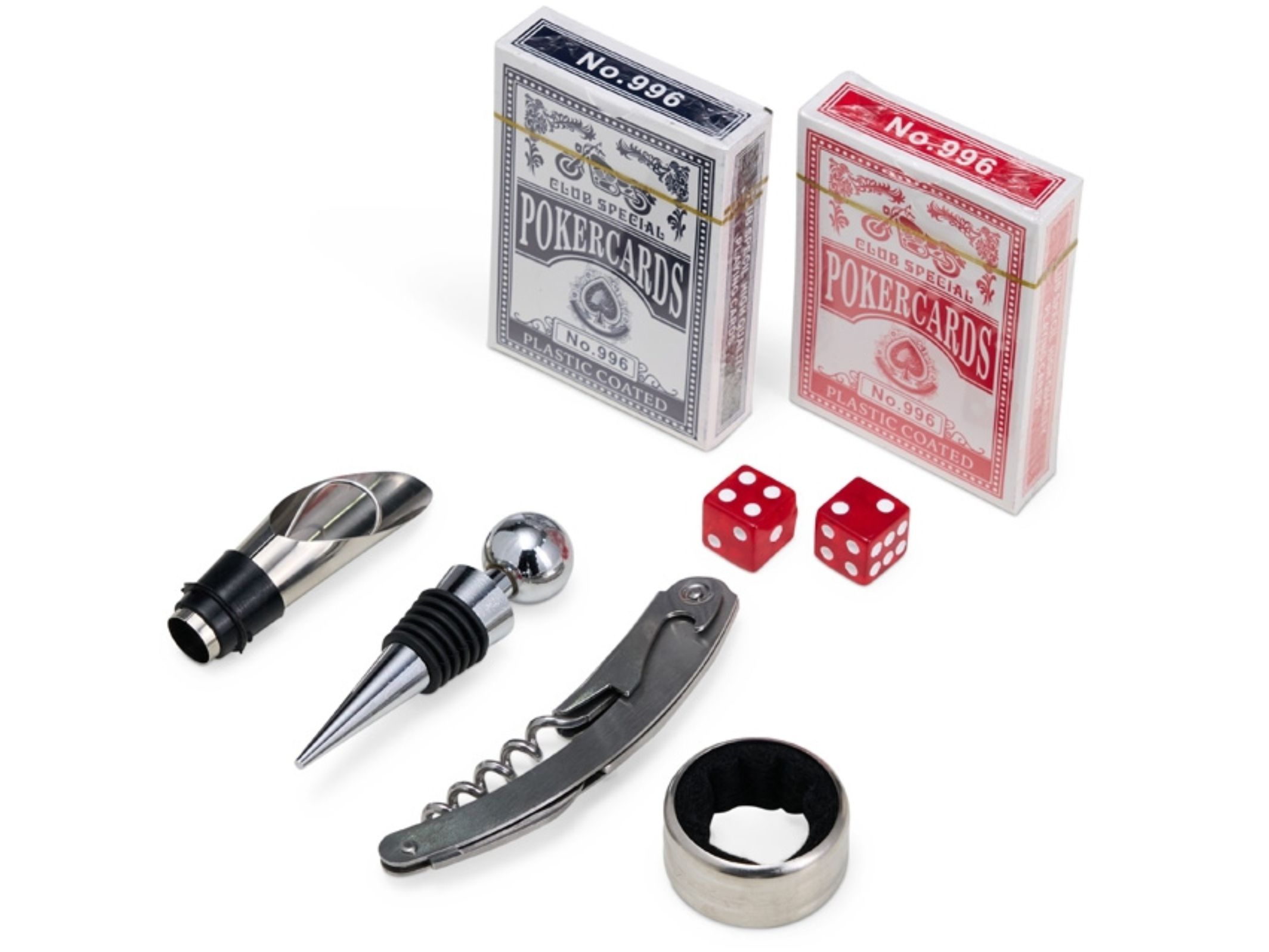 Acompanham 2 baralhos completos e mais2 dados para uma noite completa de jogos, e uma plaquinha metálica para personalização.