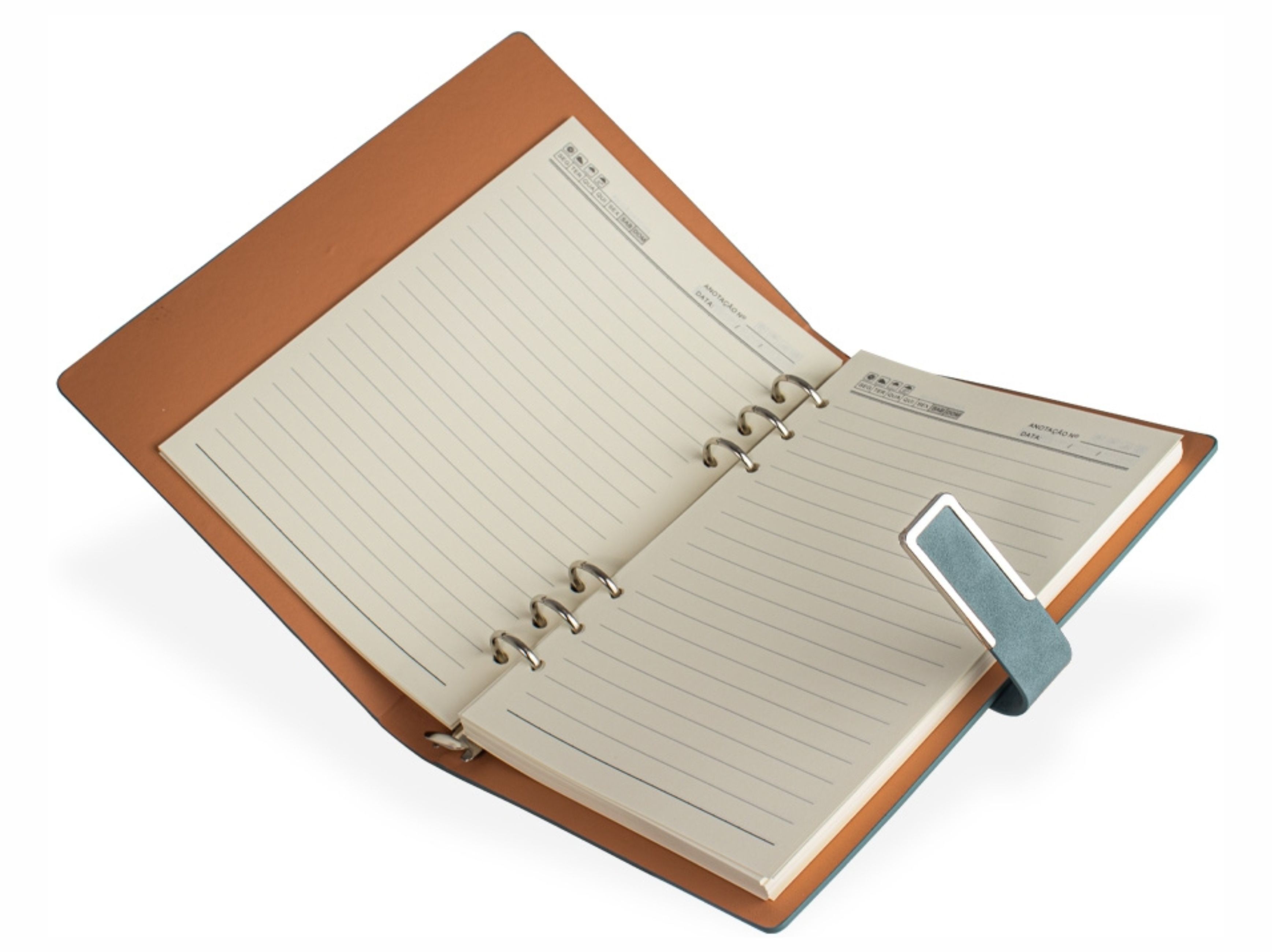 Caderno Fichário em PU, capa dura A5 e fechamento de fivela imantado que protege as 119 folhas em papel marfim.