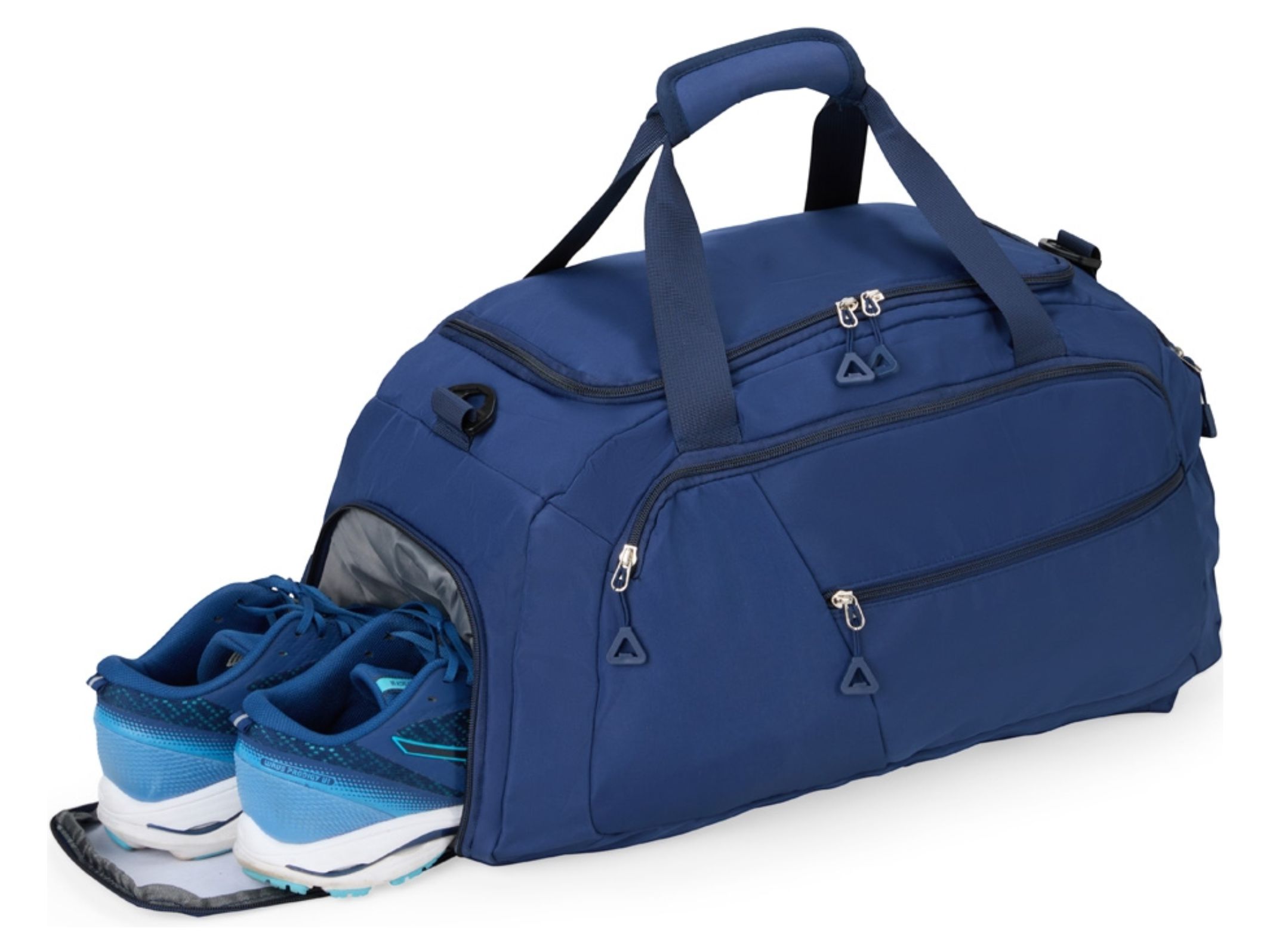 Bolsa e Mochila esportiva 28 litros. Feita em Oxford resistente à água, ela conta com espaço de sobra para armazenar trajes e equipamentos esportivos graças aos seus 4 compartimentos principais amplos, incluindo um bolso lateral mais espaçoso para carregar objetos à parte de outros itens, como calçados ou roupas molhadas. Além disso, a bolsa pode ser transportada de três formas diferentes: pela horizontal e com as mãos através do par de alças reforçadas com uma liga com fechamento em velcro para junção, também pela horizontal, com os ombros, adicionando a alça transversal removível ou ainda na vertical ao montar as alças para as costas localizadas na parte traseira, transformando-a em uma mochila convencional, com o bolso amplo da lateral ocupando o papel de abertura principal.