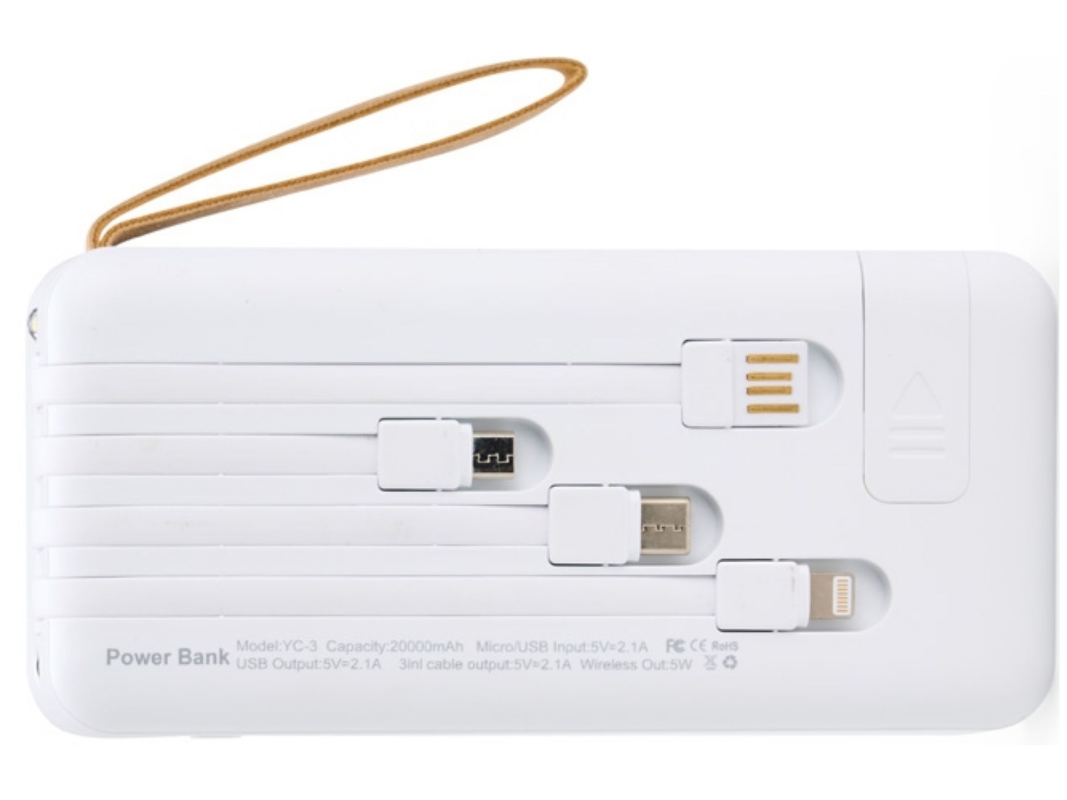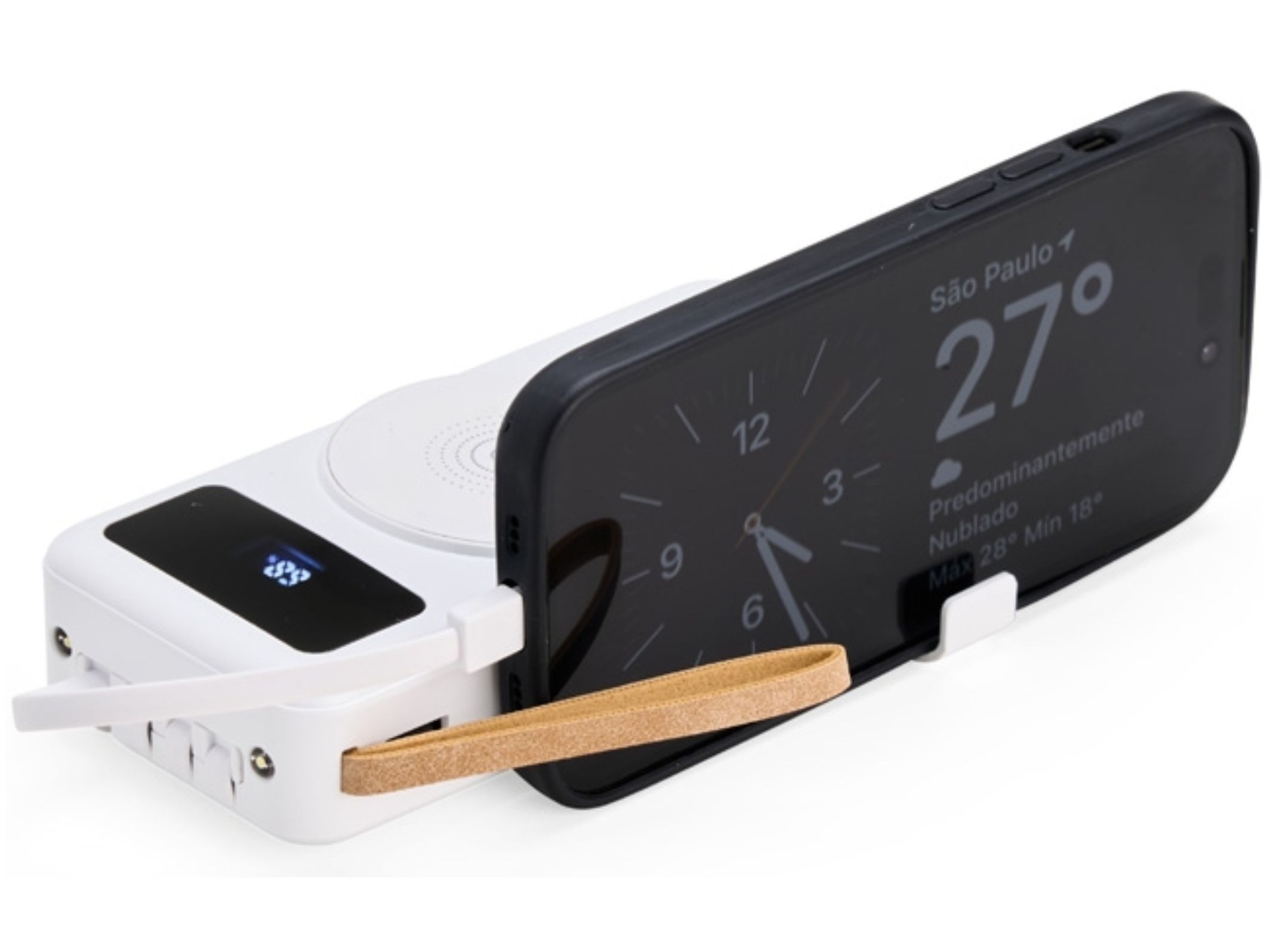 Power Bank com capacidade de 20.000mAh. Possui painel LED com indicador de porcentagem de carga da bateria do aparelho de recarga, conta com quatro cabos acoplados: USB-C, Micro USB, Lightning e Cabo USB, e também com espaço reservado para carregamento por indução, além de uma saída USB-C, Micro-USB e USB para recarga do carregador. Também apresenta um suporte lateral integrado para manter o celular na horizontal durante o carregamento, facilitando a visualização de vídeos ou participações em reuniões virtuais enquanto o dispositivo carrega, além de uma alça em couro sintético.