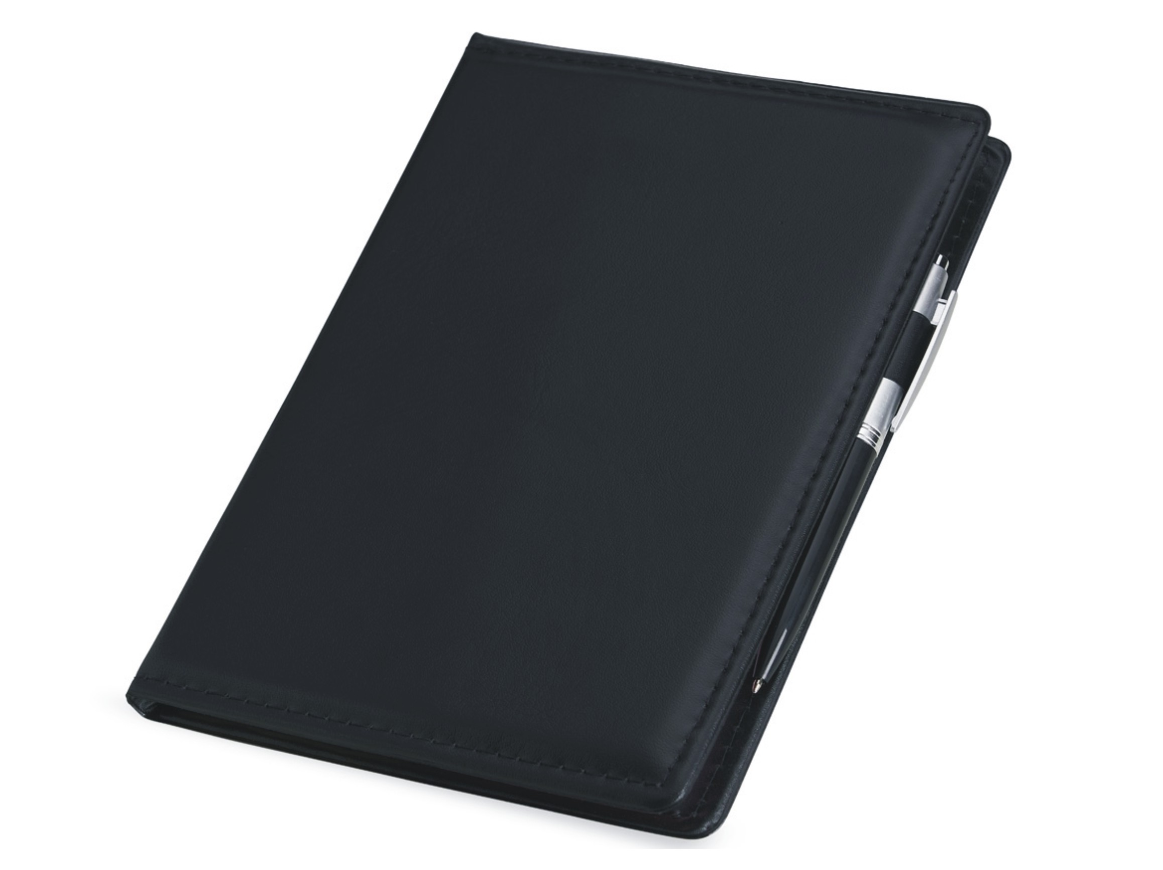 Bloco de anotações em couro sintético com post-it e caneta plástica. Contém seis blocos com aproximadamente 50 folhas, conjunto de cinco marcadores plásticos autoadesivos com aproximadamente 26 folhas,