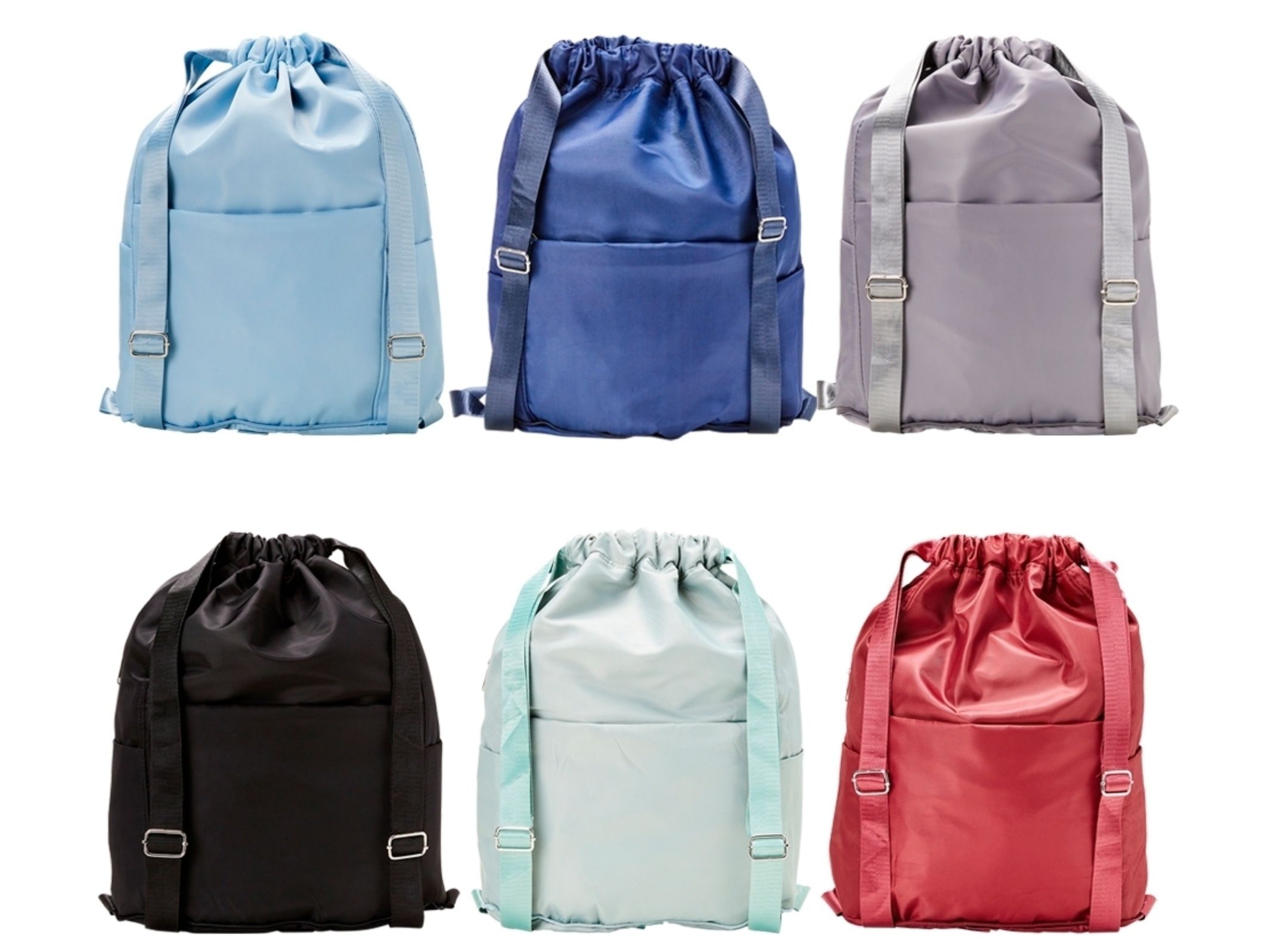 Sacola Mochila feita em poliéster impermeável e com alças ajustáveis em nylon, ela conta com um bolso frontal com fechamento em zíper, um par de bolsos laterais e mais outro na parte interna, ideal para separar itens molhados, além de um compartimento antifurto com abertura e fechamento em zíper na parte posterior. Também é possível dobrar a mochila e fechá-la em zíper, facilitando seu transporte dentro de malas, bolsas e mochilas maiores.