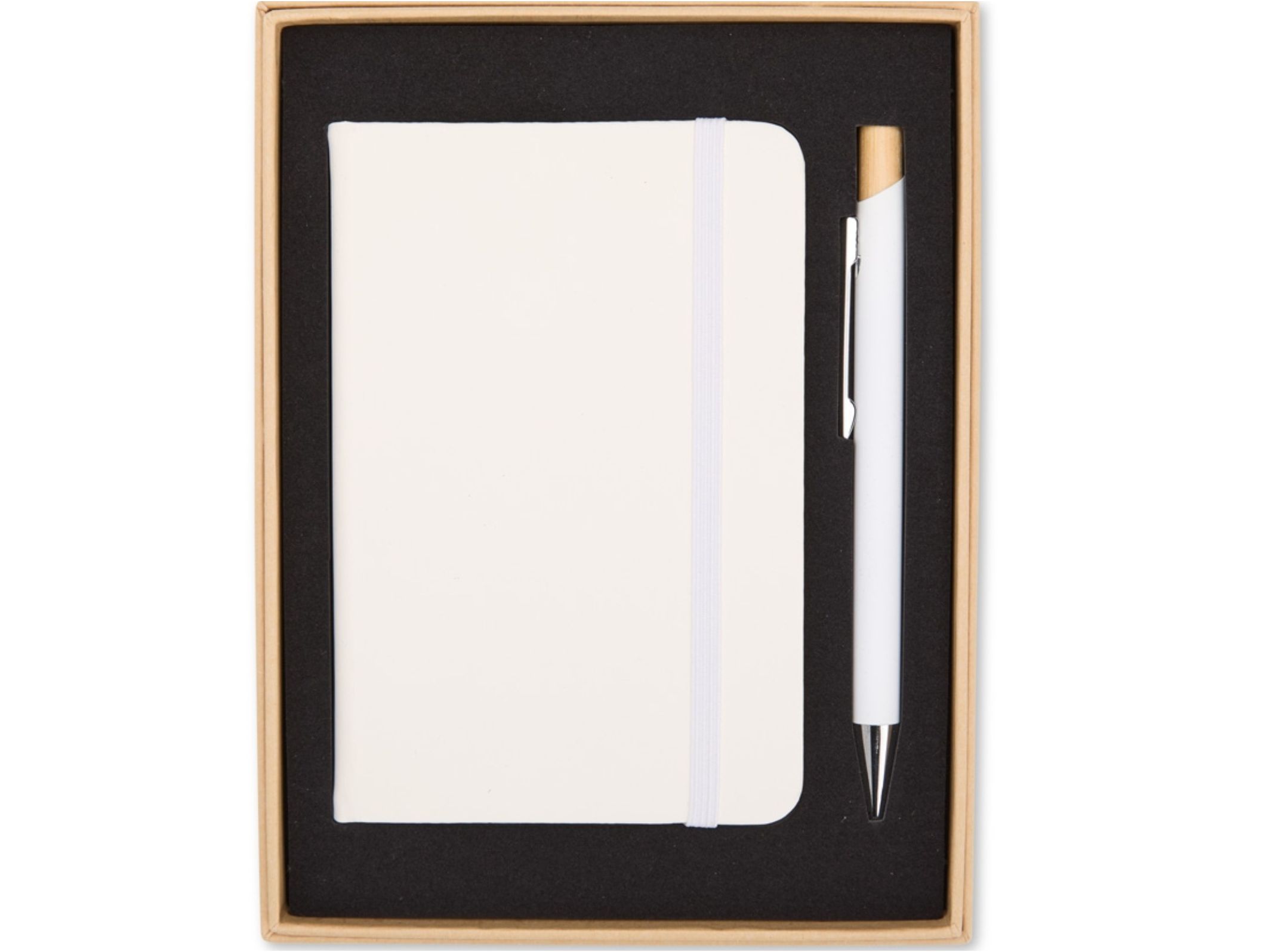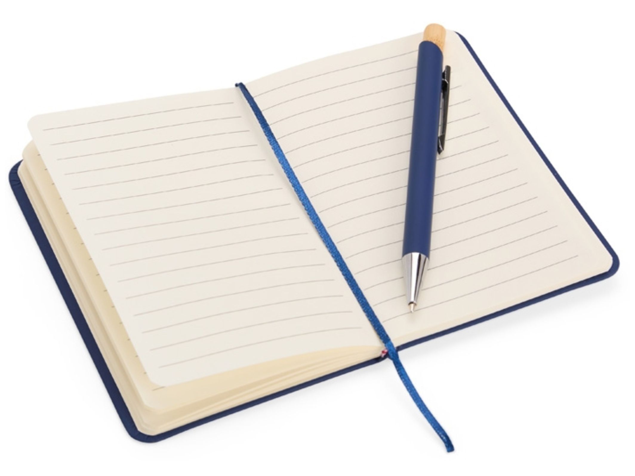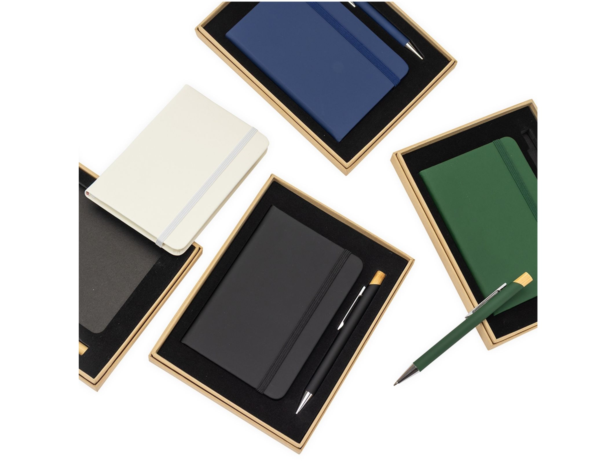 Kit Executivo com uma caderneta e uma caneta. A caderneta elástico para fechamento, além de aproximadamente 80 folhas com pauta.