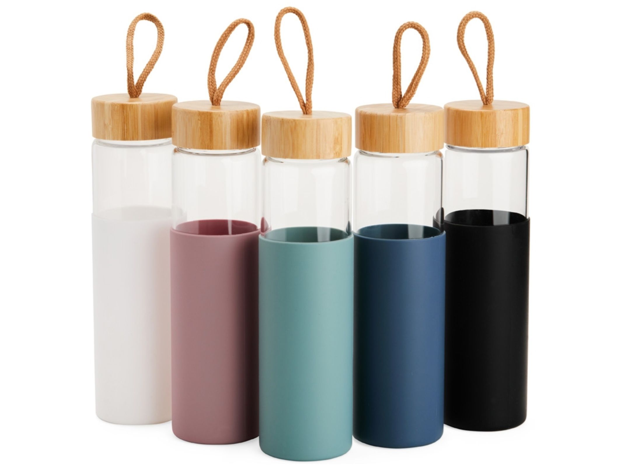 Contém tampa de bambu com alça de algodão e luva de silicone.