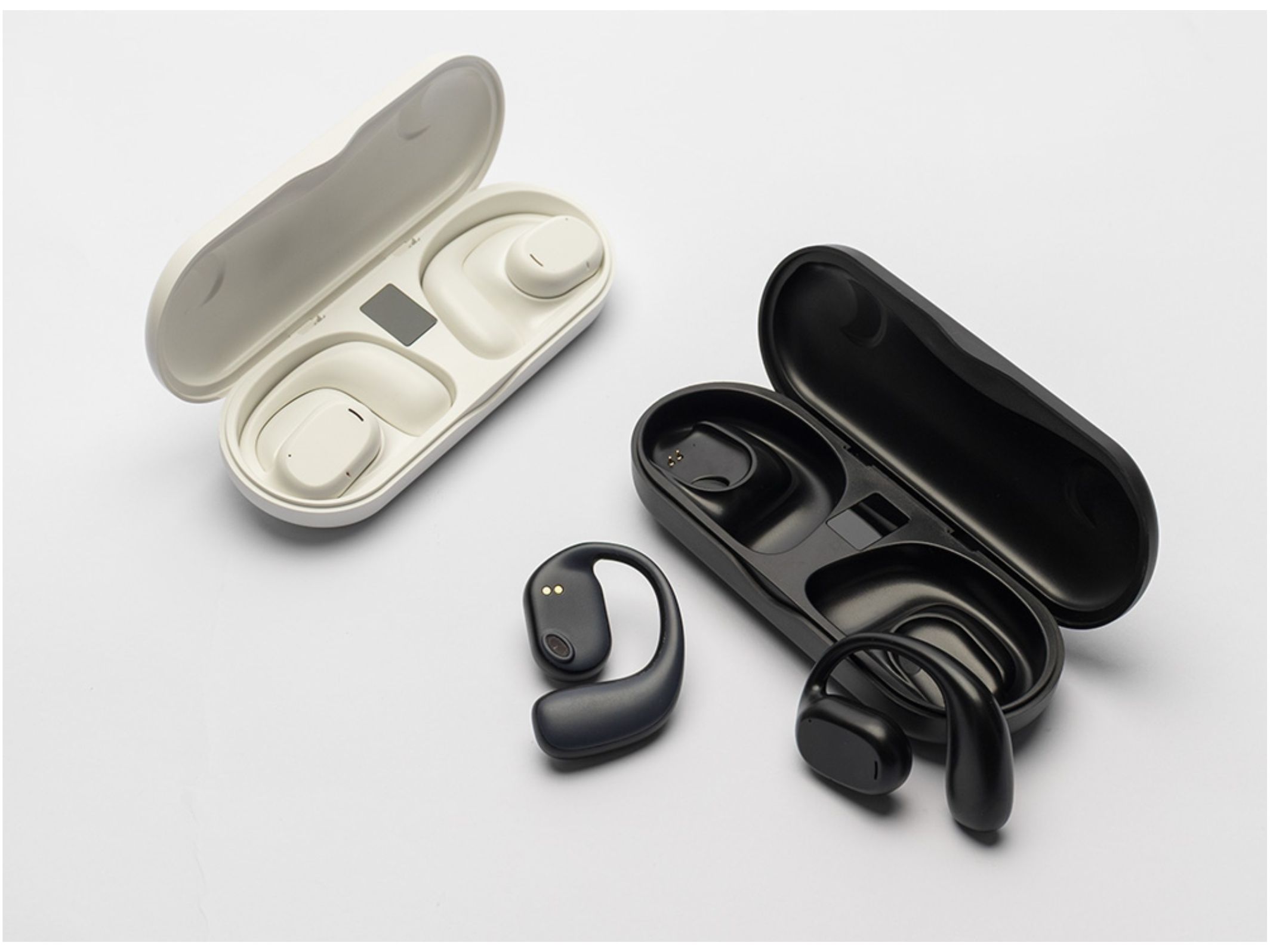 Apresenta conexão via Bluetooth 5.3 e estojo de carregamento com visor de percentual da carga total,