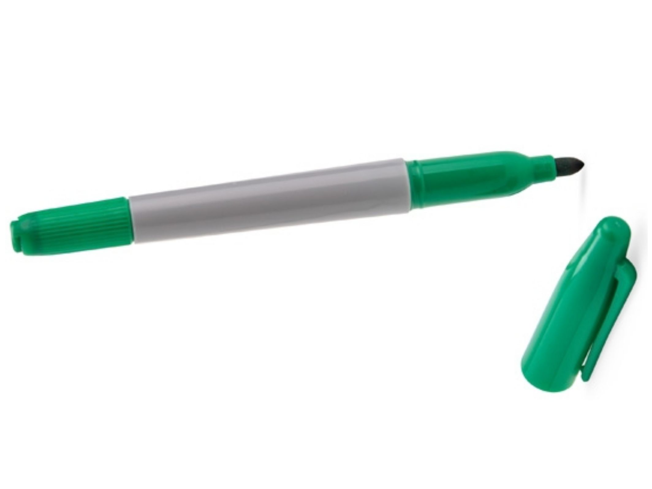 Caneta marcadora com duas ponta, uma fina e outra tipo pincel.